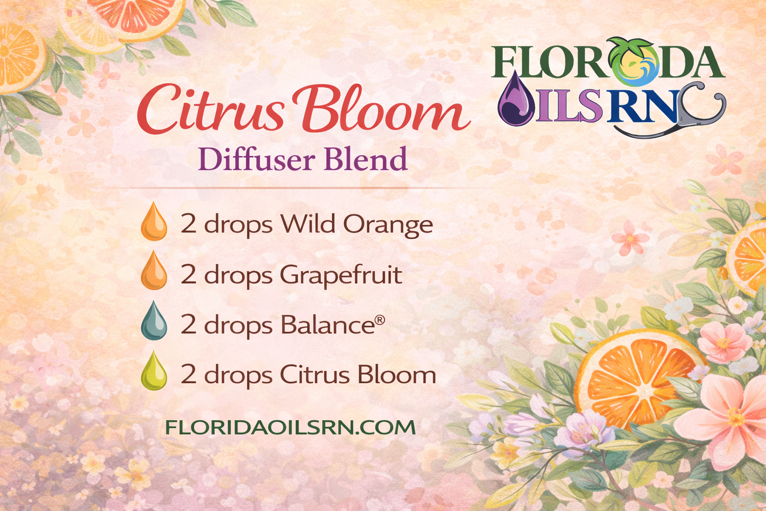 Purchase at Wholesale Price Try three other of my favorite diffuser blends, made especially to compliment the beautiful aroma of Citrus Bloom blend. Download the Recipe Card Download the Recipe Card Download the Recipe Card